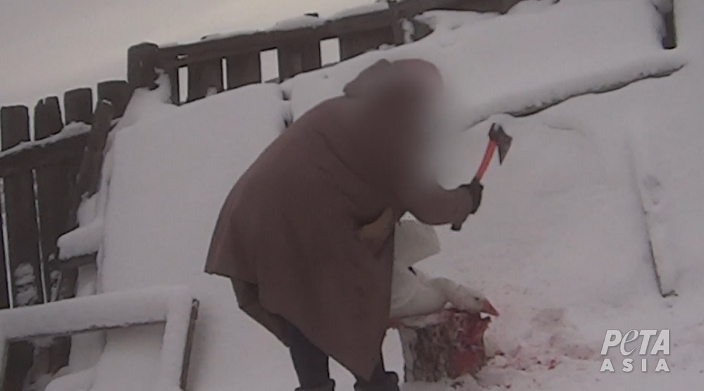 Une enquête de PETA Asie montre des oies dans une exploitation certifiée Responsible Down Standard (RDS) en Russie, qui hurlent de terreur alors que leur cou est étendu sur une souche et qu’elles sont ensuite décapitées en plusieurs fois à la hache.