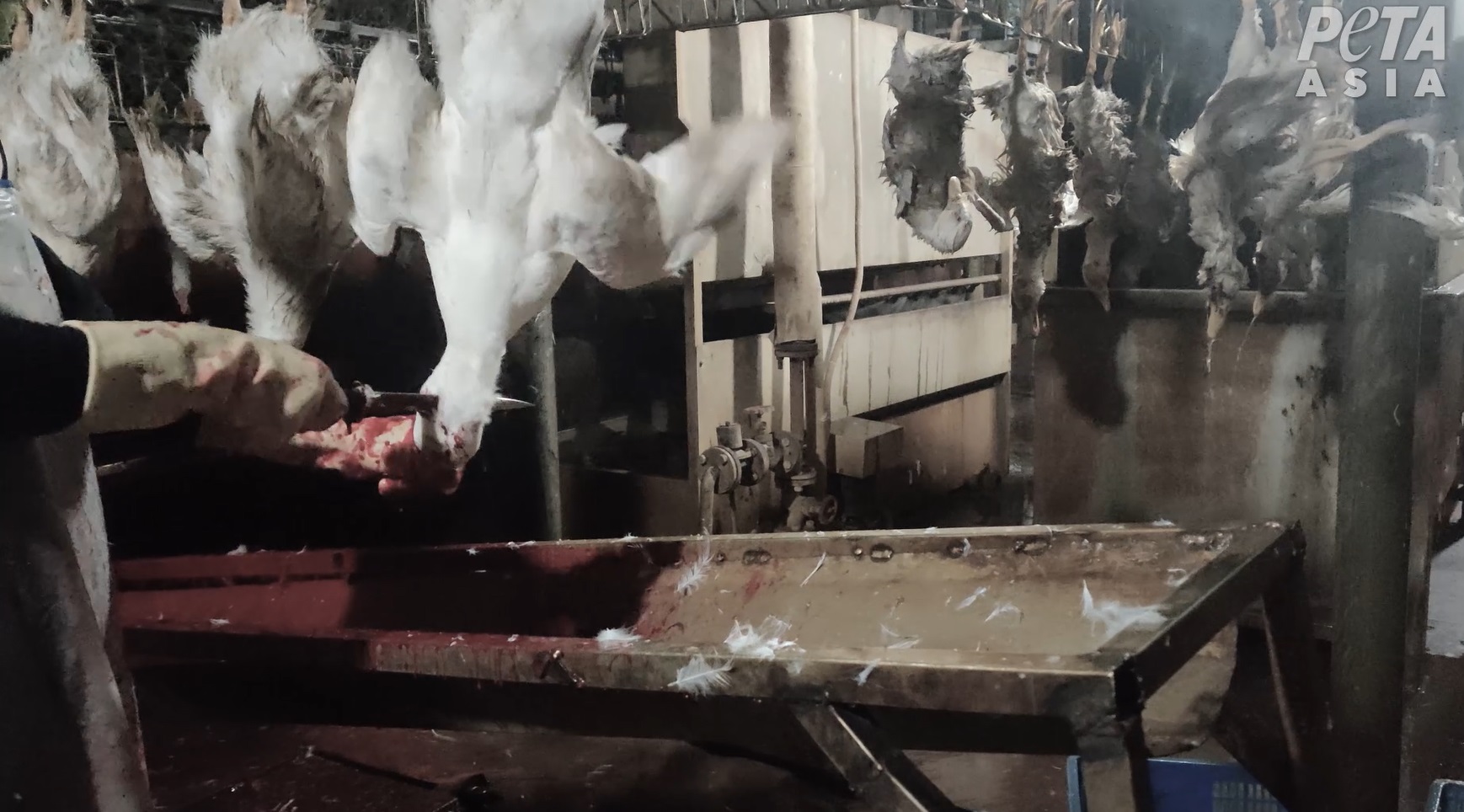 Les oiseaux enchaînés étaient traînés dans un bain d’eau électrifié qui les paralysait mais ne les rendait pas inconscients. Un travailleur les a ensuite poignardés au cou avec un couteau et les a laissés suspendus, se vidant de leur sang. De nombreux individus ont continué à bouger pendant plus d’une minute.