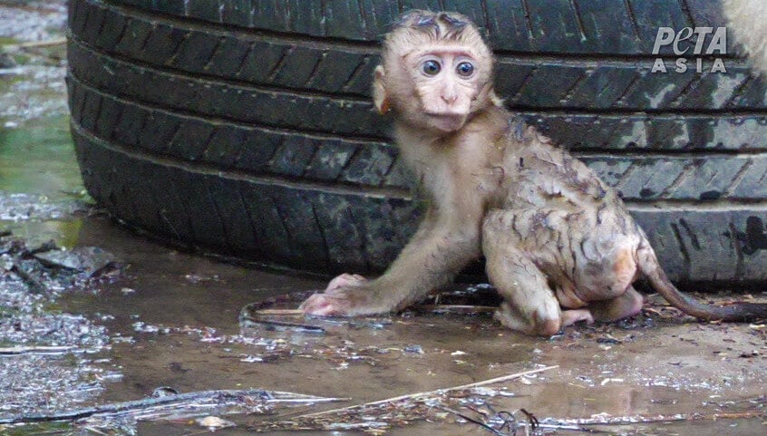 Ces petits n’ont droit à aucun type de confort ou stimulation et sont enchaînés et attachés à des barres métalliques sans chaleur, abri ou réconfort. Leur seul réconfort est celui qu’ils peuvent s’apporter mutuellement. Un singe ne pouvait ni bouger librement, ni s’asseoir par terre car il était attaché à une corde trop courte. Sa seule option était de s’asseoir sur une cage grillagée qui irritait ses pattes et son derrière sensible, ou de s’étirer dans une position de « pendaison » pas du tout naturelle, allongeant son cou et sa gorge.