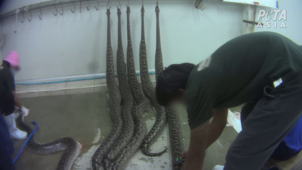 Les enquêteurs ont constaté que des employés maintenaient par le cou des pythons qui se débattaient et leur frappaient la tête avec un marteau avant d’y enfoncer un crochet en métal. Pour que leur peau soit plus facile à enlever, les employés gonflent les serpents d’eau, alors même qu’ils bougent encore. Selon le docteur Clifford Warwick, expert en reptiles qui a visionné les images, la plupart des animaux étaient probablement conscients au cours de ce processus terriblement douloureux. Les serpents étaient ensuite écorchés.