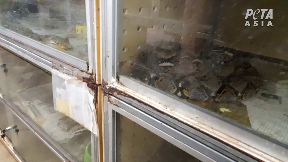 Dans la nature, les pythons se réchauffent au soleil, montent dans les arbres, nagent et explorent de larges périmètres. Dans les deux élevages de pythons visités par les enquêteurs de PETA Asie (Closed-Cycle Breeding International (CCBI) et Sisatchanalai Python Farm), les employés cloîtraient les serpents dans de petites boites et des cages vides, certaines pleines d’excréments.