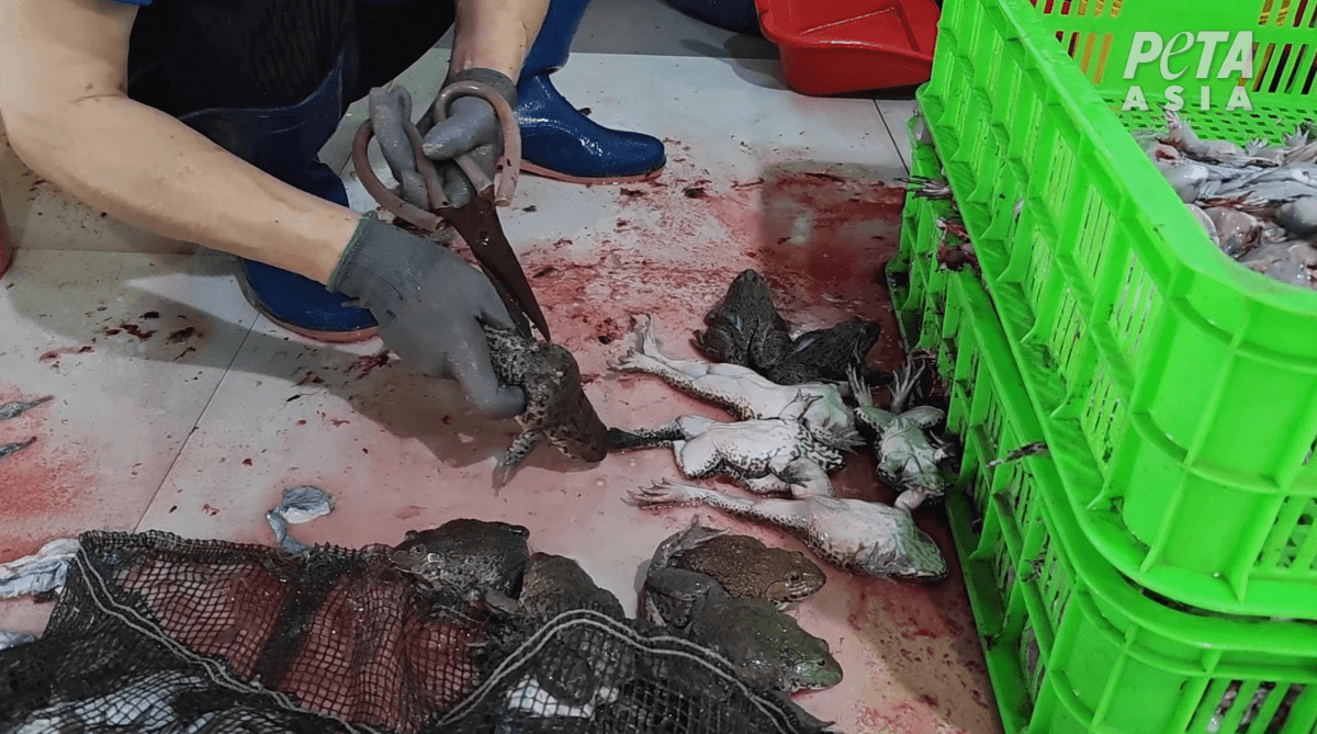 Les enquêtes de PETA Asie sur l’industrie de la viande de grenouille ont révélé que les batraciens sont décapités en Indonésie et écorchés vifs au Vietnam.