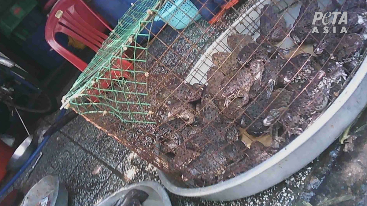 Au marché Khlong Toei de Bangkok, l'enquêteur de PETA Asie a vu des filets remplis de grenouilles vivantes et effrayées (dont certaines espèces utilisent les arbres comme « tambours » pour s'envoyer des messages) être jetés à côté des corps mutilés d'autres grenouilles abattues.
